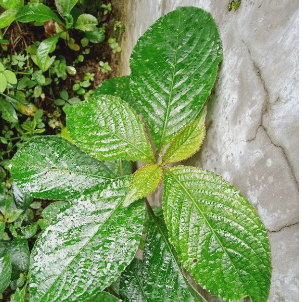 Daun tersebar roset pada pangkal helaian daun bulat telur memanjang daun paling atas memiliki ukuran terkecil bagian. Kjee pun bergegas ke rumah Kak Aspa dan beliau beri Kjee beberapa tangkai daun Pecah Beling yang Kjee tanam dalam pasu. Jeruk Purut Nanas dan Kemuning.